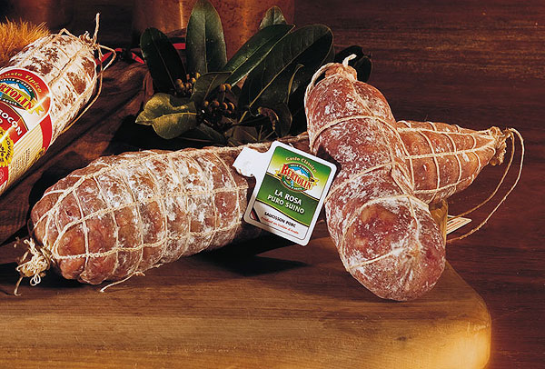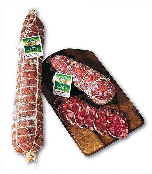 La farce qu'on obtient du mélange des meilleures viandes de porc italien avec des épices, du vin et des aromates naturels est semblable à celle des autres saucissons de la Maison Bertolin, mais la particularité de La Rosa pur porc réside dans son nom, qui vient du particulier boyau de porc sous lequel est embossé, appelé justement La Rose ou Pointe de Rose.