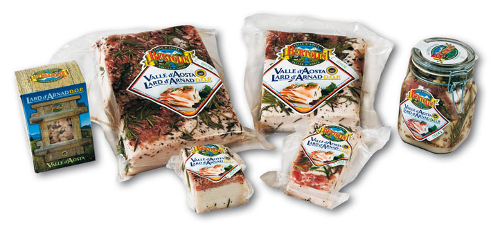 Le Lard d'Arnad, produit à appellation d'origine protégé (AOP) est obtenu uniquement par le traitement du palet de porc dont le poids est supérieur à 200 kg, provenant des élevages de la Vallée d'Aoste, du Piémont, de la Lombardie, de l'Émilie-Romagne et de la Vénétie.