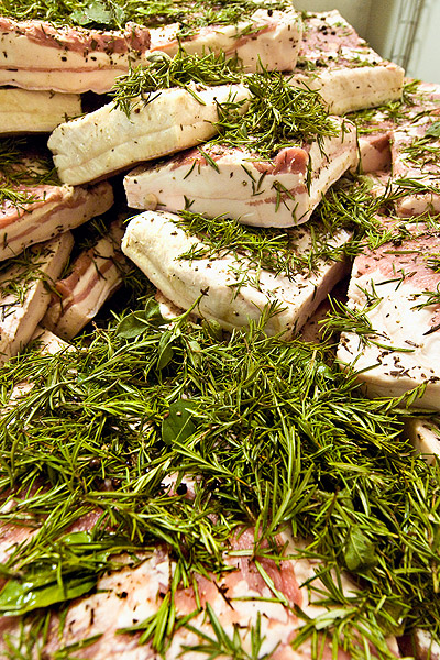 Soigneusement dépouillé et ensuite équarri, on le laisse sécher dans les doils, anciennes cuves en bois de châtaigner ou de chêne, où l'on dépose en alternance jusqu'au remplissage des couches de lard superposées et un mélange composé de sel, d'eau, d'épices, d'arômes naturels et d'herbes aromatiques de montagne.